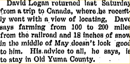 1912 "For Sale - Thirty bushels of tested seed corn - David Logan, eight miles south and two miles west of Yuma"