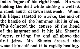 1910 "William Sheets has been experiencing all kinds of trouble drilling a well on the Ed Adair homestead. He lost the drill at a depth of about 60 feet and had to dig it out."