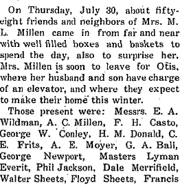1914 "Mrs. Sarah Sheets, living southwest of town, left Tuesday afternoon for Iowa, in response to a message announcing that her mother was very low and not expected to live but a short time."