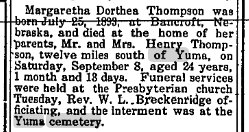 September 1914 "Miss Margaret Thompson arrived home Wednesday from an extended visit with relatives and friends at Oxford, Nebraska."