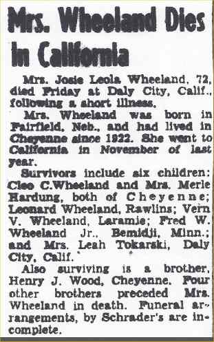 Fred died Nov 10, 1943, age 63 per the Cheyenne 1945 city directory 29162475 Josie 29162476 was living at 2023 Pioneer Avenue. She died January 11, 1957.