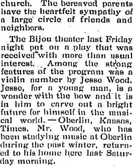 January 1913 "Jesse Wood left Tuesday for Oberlin, Kansas, where he will spend the remainder of the winter with his parents."