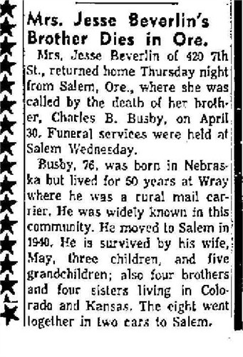 Harvey Eugene Lyon, a retired rear admiral and submariner who helped to build Trident missile submarines in the 1970's, died on Monday at his home in Fairfax, Va. He was 71. The cause was a heart attack, his family said. April 1, 1995 New York Times Admiral Lyon was born in McCook, Neb., graduated from the United States Naval Academy and did postgraduate work in electrical engineering at the Massachusetts Institute of Technology. He spent 30 years in the Navy, mostly on submarines. He served in the Pacific in World War II and the Korean War. His assignments also took him to the Atomic Energy Commission. On July 2, 1942, Harvey Eugene Lyon of McCook left for Baltimore to complete his exams for his entrance into the United States Naval academy in Annapolis, Maryland. The August 14, 1942, McCook Daily Gazette carried a story detailing his life so far as a midshipman. Harvey, son of Mrs. Mabel Lyon, had been a former Gazette carrier. In a letter to his mother, Lyon wrote, "The feeding of this large group of midshipmen is done in one huge mess hall underneath the rear terraces of Bancroft hall. The building is six hundred feet long and about one hundred feet wide. In it are fed something over three thousand young men, so you can imagine the size of the place." Lyon had passed his swimming test but only 60 out of the 400 in his battalion had passed it. He was allowed to go to chapel, now that he had taken all of his "shots" and said it was a beautiful sight with 2,500 middies in their uniforms. John Wesley Beverlin registered with a Wray address, born January 23, 1885, father Jesse Fremont Beverlin. In 1920 Yuma County Jesse F. is still 57, Ella J. 55, with Lucy 22, Jesse 17, Lila 15, George 13, and Geraldine 11. Jesse J. Beverlin married Florence Busby December 22, 1923, recorded in Kit Carson County. In 1930 Jesse "Beralin" is 28, Florence E. 24, with Louise J. 1 and Dean P. 6. In 1910 Hale precinct, Yuma County, Hardin L. Lundy - second marriage, 34, born in Missouri, married 20 years to Cassie 39, West Virginia. They have Carrie m. 19 Kansas, Nora F. 16 Kansas, and Ana M. 14 Indian Territory. Charles Marion Busby married Amy May Lundy March 20, 1918, recorded in Yuma County. In 1920 and 1930 they're in Yuma County. Charles born about 1887, Amy about 1898, Charles L. 1919, Louise M. 1921, and Orville R. 1928. They're in Woodland Park, Colorado in 1940, "any kind of work" Hardin L. Lundy 1856-1942 is buried in Salem Oregon 75281827. So is his daughter Nora F. Rolow 73123711