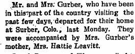 "Morris" Chester Surber married Ida May Leavitt Feb 22, 1904, recorded in El Paso County. 1905 "Mr. and Mrs. Greatsinger visited with Wm. Leavitts Sunday."