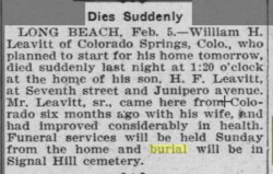 In 1910 Long Beach, California, Henry S. Leavitt is a crapenter, 41, Lizzie 40, both born in Michigan, with Harvey C. 18 Kansas, Nellie 15 Colorado, Josephine 12 Colorado, and Frank 10 Colorado.