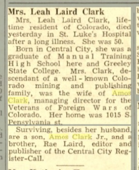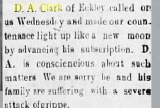 April 1923 Montrose, Colorado "Mrs. Frank D. A. Clark arrived on Wednesday from Denver to be with her husband, who travels tor the Moore Hardware and Iron Co., and who was taken ill here on Sunday night Mr. Clark Is getting along very nicely."