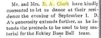 One of the speakers was Amos Clark of Denver who, with his wife, made an exhibit at the Library of old newspapers and pictures of Eckiey at its beginning. Mr. Clark's father, D. A. Clark, owned this land and his ranch buildings stood where Eckiey is now. He operated the first store here in 1890.