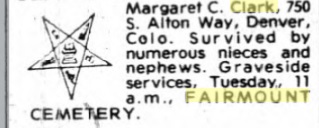 the Olinger Mortuary, Boulder st. Burial will be in Fairmount.