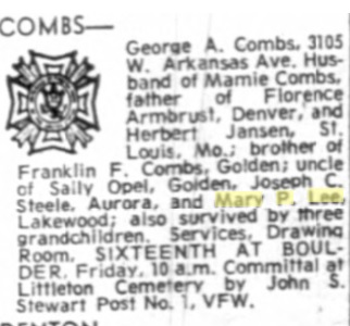 Mary P. Lee, divorced, born Dec 4, 1912 in Denver, married Jule E. Tubbs on July 28, 1951 in Cheyenne, Wyoming.