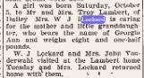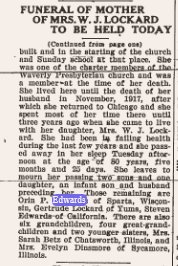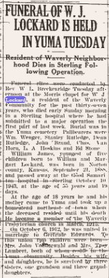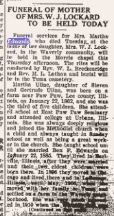 May 8, 1924 "Mrs. Martha Edwards, of Bridgeport, Nebraska, arrived from Omaha last Friday for a few days visit at the home of her daughter, Mrs. James Lockhard, northeast of Yuma."