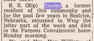 "Mrs. E. E. Crosby suffered a stroke of paralysis last Saturday about 12:30