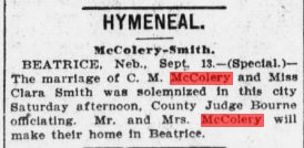 Charley, 25, born in Illinois, married Clara Smith 21 born in Nebraska, on September 10, 1904 in Beatrice, Nebraska.