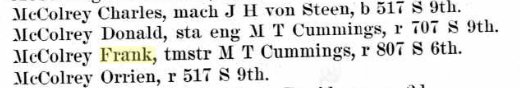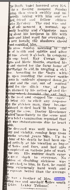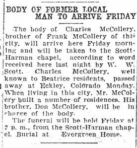 Charley McColery registered for WWI in Beatrice, a real estate agent, wife Clara. He was born June 17, 1879.