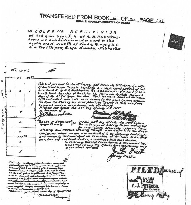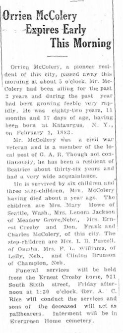 In 1885 Gage County Orrien McColrey is a teamster 53, Hannah 34, George 29, Clinton 18, Etta 16, Hattie 15, and Evaline 11.
