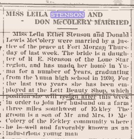 Donald Lewis McColery married Lelia Ethel Stenson in Fort Morgan, Colorado on May 18, 1933.