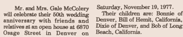 February 1950 "D. L. McColery, Jr., of Loveland was transacting business here Monday, Donnie is now district representative of the Archer Oil Co. of Omaha and is moving from Loveland to Ft. Morgan."