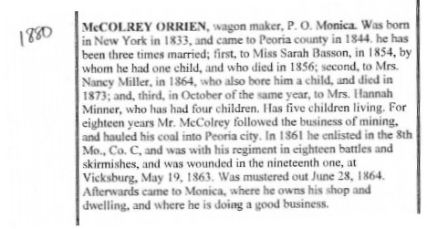In 1880 Washington County, Kansas, O. McColery is a wagon maker, 45, born in New York, with Hannah 30 Ohio , Clinton 13 Ohio, Henrietta 11 Missouri, Hattie 10, Evaline 8, Frank 7, Lenora 2, and Charles eleven months. – the last four kids born in Illinois.