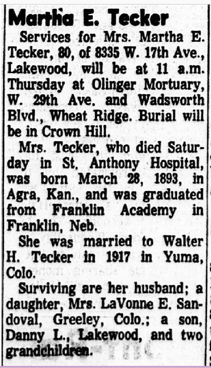 In 1970, Walter H., retired, and Martha E. Tecker live at 8335 W. 17th Avenue in Lakewood. Danny also lives there, employed with the State of Colorado.