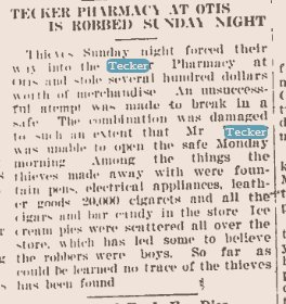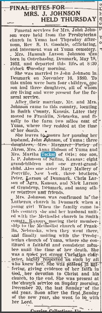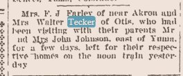 September 1920 Yuma "Mrs. Walter Tecker and baby, who had been visiting with Mrs. Tecker's parents, Mr. and Mrs. John Johnson east of Yuma, returned to her home at Otis on the noon train Saturday."