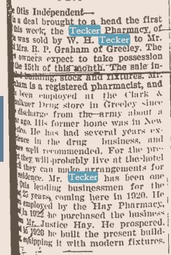 Harmon's son Walter H. Tecker is a druggist in 1920 Eckley, Colorado, 26, born in Nebraska, with Martha E. 28 born in Kansas.