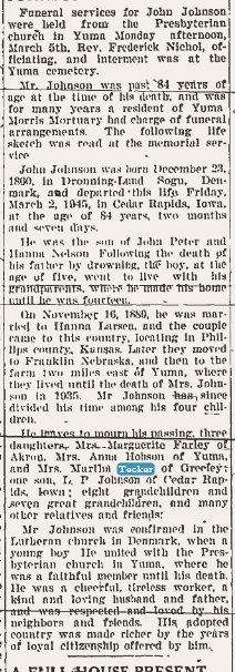 August 1929 "Mrs. John Johnson and her sister, Mrs. Mary Mullery, of Kansas, who had been visiting with relatives in Otis and Akron for a week, returned to Yuma on the afternoon train Monday."