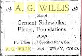 1914 Wray "E.L. Willis of Creston, Iowa is in Wray this week visiting his brother W.L. Willis, and family. "