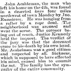 1914 "John Ashelman, who has been visiting his uncle, John Ramseier Sr., and family returned to his home in Denver Monday."
