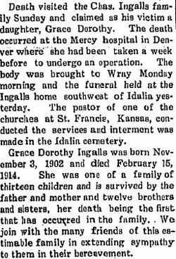 Katherine M. Ingalls, age 15 in 1910, is with Charles E. and Bertha M. Ingalls near Idalia. with ten siblings.