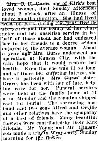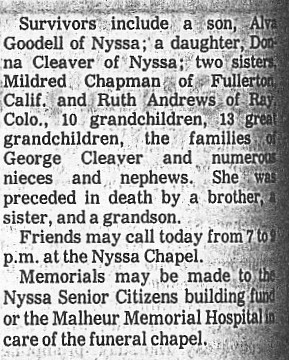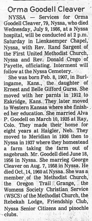 Ontario Argus Observer Ontario, Oregon July 2, 1956 Funeral Held For Malheur County Leader Funeral services were held Sunday at 2:30 for Alva Platte Goodell, Malheur county commissioner, who died at his home Thursday night following a heart attack. He was 61. Goodell had lived in this community for the past 20 years and was a prominent rancher and farmer. He was serving his third term as county commissioner. Goodell was a veteran of the first World War and captain of the state guard in World War ll. He had been a member of the American Legion for 35 years. He was a member of the Malheur Pomona Grange an officer of the Oregon Trail Grange, a past member of the Elks and a member of the Knife and Fork club. Goodell had served on the Malheur County Fair Board and was a member of the Owyhee Riding club. Mr. Goodell was born Jan. 22, 1895, in Heigler, Nebr., and was married to Orma Gurss in 1925 in Wray, Colo. He was a member of the Methodist church. He is survived by his widow Orma of Nyssa; one daughter, Mrs. Donna Cleaver of Nyssa; a son Alva Jr., also of Nyssa; five grandsons; two brothers, Charles of Iowa and William of California; two sisters, Mrs. Leslie Topliff of Nyssa and Miss Elizabeth Goodell of Emmett, Idaho. Services were held in Lienkaemper's Chapel in Nyssa with Rev. Paul Ludlow of the Methodist church officiating. Interment was at the Nyssa cemetery with the concluding services conducted by the Nyssa American Legion. Honorary pall bearers were men who had served with him in the county administration. They included Judge G. Y. Chester, A. L. Hammack, Don C. Hosler, John Koopman, John Elfering, George Van Horn, William Leggitt, Harry Sackett, Taylor Sandivgan, Carl Sperling and Judge Lloyd Rae. ![]()