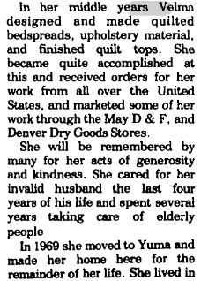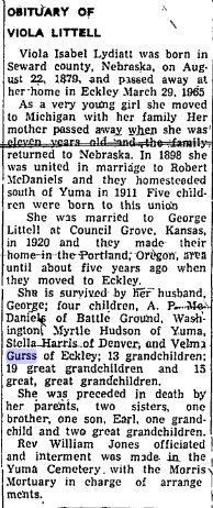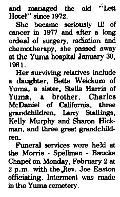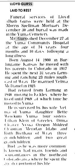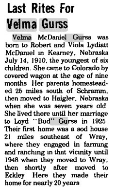 Velma Lela Viola McDaniel born July 14, 1910, married Lloyd Gurss September 29, 1925, died 1971. They're buried in Yuma - Velma 1910-1981 # 49997131 and Loyd E. 1900-1975 # 49997357