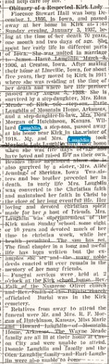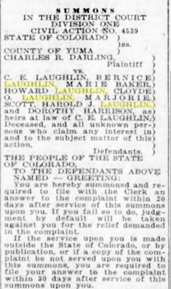 Born November 25, 1850 in Mercer County Missouri, died August 3, 1933 in Kirk, Yuma County, Colorado. He immigrated to Colorado abt. 1909. Remarks: Other family members traveling with him were: his son, Willard M LAUGHLIN, b 30 Aug 1879, Mercer Co., MO died 21 Dec 1918 in Kirk, CO. Willard's wife, Dora Belle (RAMBO) LAUGHLIN, b 10 Sept 1883, Mercer Co., MO, died 5 Jan 1969 in Sterling, KS; their sons, Donnie Gerald LAUGHLIN, born Aug 20, 1901 in Lineville, Iowa, died May 1984 in California ; Cecil Clifford LAUGHLIN, b Feb 18, 1904, in Mercer Co. MO, died 16 December 1929 in Hutchinson, KS; Lorrence Olen LAUGHLIN, b 23 Dec, 1908 in Mercer Co., Mo., died 25 Oct 1993 in Hutchinson, KS. Dora LAUGHLIN'S mother Sarah Hannah RAMBO b Sept 10, 1867, d Aug 19, 1954 in Wichita, Ks. and her son Lowell RAMBOb April 25, 1897 in Mercer Co., Mo, died in Jul 1976, also immigrated to Colorado with the Laughlins. After the death of Willard LAUGHLIN in 1918 all with the exception of James Harve LAUGHLIN emmigrated to Hutchinson, Reno County, KS. Submitted by Carol (Laughlin) Macdonald jcmacdonald@myexcel.com. 4/15/2000 |