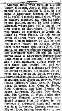 July 1934 Mrs. Henry Bolin, Mrs. Cora Hobbs went to Lawrence Kansas to be with Charles Bolin, who was not expected to live. Mrs Harlan Paratt and their dauther and husband were down a short time ago.