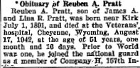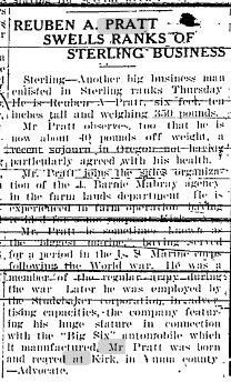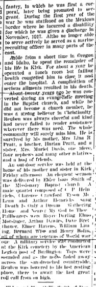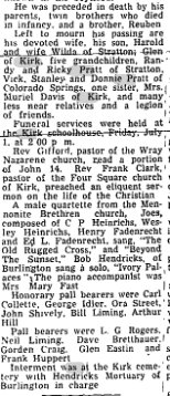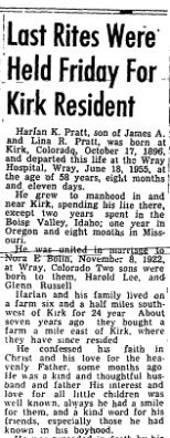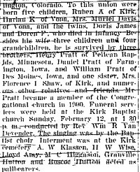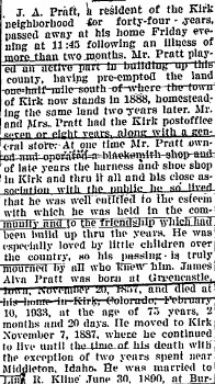 March 2, 1939 "Mrs. F.I. Shaw received a telegram from Des Moines Iowa telling of the illness of a brother, Dan Pratt. No hopes were entertained for his recovery. Mr. Preatt lived here more than thirty years ago. He had a homestead southeast of Kirk. He is the uncle of Mrs. June Nash of Idalia and Reuben and Harlan Praatt and Mrs. Muriel Davis of the Kirk vicinity.