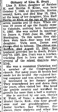 February 6, 1941 "Mrs. Lina Pratt received word last week of the death of an uncle, Harlan Bailey, of Bussey, Iowa. Mr. Bailey and family lived here and at Wray in the year 1900, and made several visites here through the years. Mr. Bailey was born more than seventy-nine years ago on a farm near Bussey. He lived on that farm all of his life with the exception of the time he resided in this state."