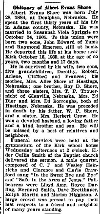 Albert Evans Shore 1882 1939 # 67354711 is buried in Kirk, with Susanna Viola 1886-1954.