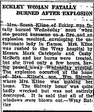 July 28, 1911 "Mrs. Susan Bell and John Kline were Wray business transactors the latter part of the week. "