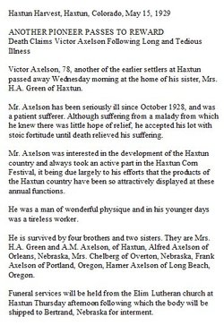 In 1910 Haxtun precinct, Phillips County, Andrew M. Axelson is 57, Lottie A. 47, George W. 19, Effie C. 17, Carl P. 15, Louise M. 12, Mabel O. 10, and Ella E. 5. Brother Victor, 54, is also living with them. "May 1929 - Victor Axelson, 78, passed away at the home of his sister, Mrs. H.A. Greene in Haxtun"