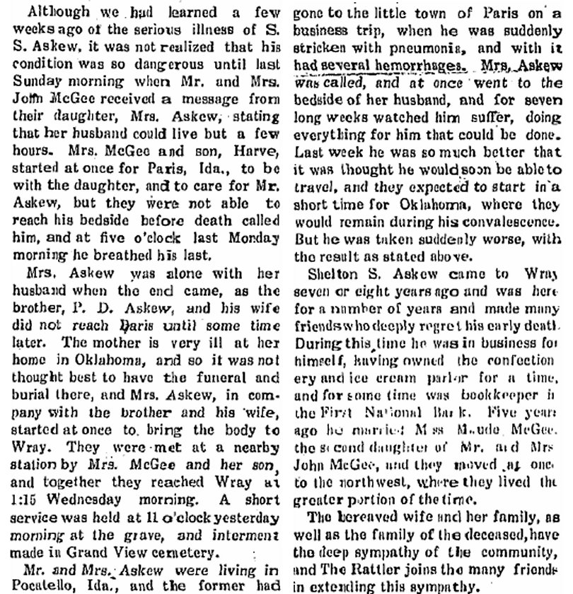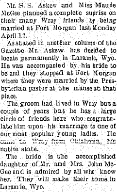 John A. McGee - 1882-1931 is buried in Wray's Grandview Cemetery. Between him and A. Harry McGee1882-1935 is a Shelton Askew 1883- 1914, John's son-in-law. It's possible that Maude later married Dan Funk of Wray.