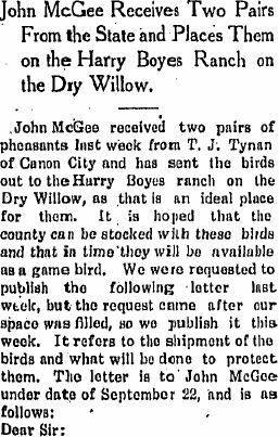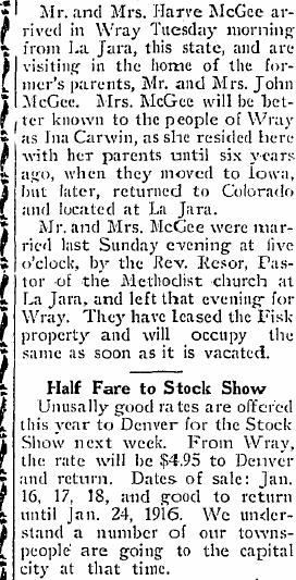 In 1910 Wray are John McGee, 56, born Pennsylvania a butcher., Elizabeth 49 Illinois, Belle 22 Illinois, Harry A. 26 Illinois is a carpenter, and Harvey T. 21, Nebraska works at the meat market