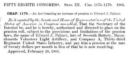 In 1903 the National Tribune carried an advertisement "WANTED - The address of Edwin W. Palmer of the 7th Mass Lith Art Vols, by Edward J. Palmer, 412 "Harr??on bt, Mt. Vernon I..?