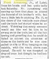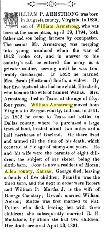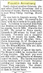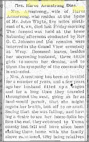 Frank (Franklin) Armstrong (b 7 July 1830 or 1831 at Augusta County, VA- d. 25 Mar, 1910 Wray, Yuma, CO) m Polly Ann Bowles in Indiana 1854 (approx) (d-1877) Children that I know of were: George Harvey Armstrong (born 14 Jul 1863. Winterset, Iowa, died 26 Sept. 1926, Wray, Colorado) m. Hanna Whyte Children: Anna, Effie, & Myrtle Hulda D. Armstrong ( 27 Oct. 1868 Union Co, Iowa - d 31 Mar 1900 Wray, Yuma, CO) m. George Epperson Franklin Armstrong, Jr. (?) was in Montana in 1910 Cora Augusta Armstrong (1865) m. Whallon was in Chandler, OK in 1910 (Cora A. Armstrong, 18, married J.R. Marley, 22, in Union County Iowa on January 1, 1884. In 1900 Lincoln County, Oklahoma, she's just married to Charles Whallon, 42, born in Indiana. Hattie Marley is 15, bon in Iowa, Dillon 13 in Washington, Kattie 11 in Kansas. Four Whallon kids were born in Kansas and Oklahoma. Charles W. Whallon 1858-1931 is buried in Chandler, Oklahoma # 51722462. "Charles W. Whallon was born in Terre Haute, In. in 1858 to Cornelius and Sarah Harr Whallon. He married Ella Lints. then Adaline Van Ness who died in childbirth in 1894. Then Cora Armstrong who died in 1923. Then Maud Wallace Watts . Mr. Whallon had 9 biological children, one 3 months after he died . His children with Adaline were; Dovie, Ethel (m),Eva Mae, and Cornelius (nealy)----With Cora; Frank Henry and Sarah Ann (Annie)----With Maud : Charles Wesley Whallon-Cole (adopted to Coles) and Mary Lou, and Jimmie Dale Whallon-Schmitt (adopted to Dotter,then Schmitt). The adoptions occured after Mr. Whallon died, and Maud fell very ill.") Flora Armstrong (1870) unknown where she was. Probably not living in 1910 Any information about their families would be appreciated. Thanks--Sally Watkins rdswatkins@msn.com |