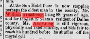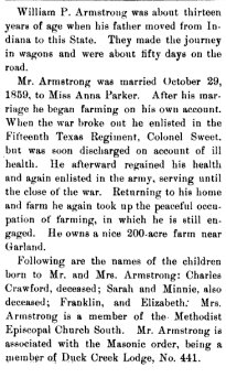 Biographical and Historical Record Of Ringgold and Union Counties, Iowa, page 580 Franklin Armstrong, one of the practical farmers of Dodge Township, living on section 28, is a native of Augusta County, born July 4, 1830, a son of William Armstrong who is now living in Kansas. Our subject accompanied his parents to Morgan County, Indiana, in 1842, and there he attended school in the rude log-cabin school-house of his neighborhood with its slab seats, stick and mud chimney and puncheon floor, and in this building he received the rudiments of an education. He was married in 1851 to Miss Mary A. Bowels, a daughter of John Bowles, deceased, and of the 10 children born to them six are still living - William, Frank, Harvey, Augusta, Hulda and Flora. They have a grandchild named Maggie living with them, whom they have adopted. In the spring of 1855 Mr. Armstrong removed from Indiana with his family to Madison County, Iowa. In 1858 he went to Arkansas, returning to Iowa a year and a half later, and in 1865 came to Union County. He went to Texas in the fall of 1875, returning to Union County in the spring of 1878, where he has since been engaged in farming and stock-raising. He was reared a farmer and has always followed that avocation, in which he has met with great success, and is now the owner of 240 acres of choice land where he resides. He is one of the public spirited citizens of Dodge Township, and served his township effectively as trustee and school treasurer. He is a member of the Masonic fraternity. |