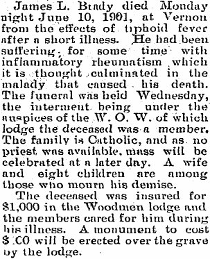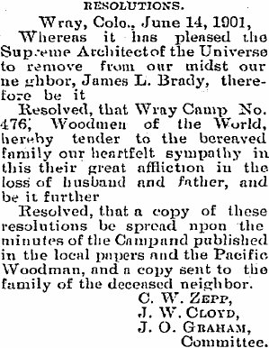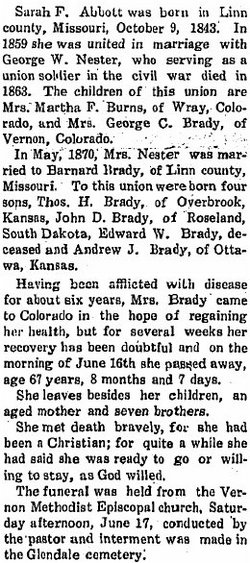 June 15, 1901 "Lawrence Brady died Tuesday morning and was buried Wednesday at Glendale Cemetary (sic) by the Woodmen." FindaGrave # 75792493 says this is James Lawrence, born 1862 in New York, son of James Lawrence Brady, spouse of Georgia. 1910 Yuma Co, Colo census, Pct 8, Vernon, Georgia C. Brady, 45 Mo (wid, 9 ch, 8 living), farmer, general farm, Iva M.,18 Col, clerk, retail store, Paul J.,16 Col, working, home farm, Bertha A.,14 Col, Ralph C.,12 Col, Earnest F.,9 Col. 1914