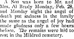 (2) Lucile M. Brady, b ca 1911 Colo. Mary Lucile Brady 1910-1925 is buried in Glendale # 80214116. (3) Marguerite L. Brady, b ca 1912-13 Colo. She might be the Margaret Brady who married Clinton Cyrus Ayres June 15, 1932, recorded in Lincoln County, Colorado. In 1940 Elbert County, Colorado Clinton C. is 30, Margaret L. 26, with Helen M. 6, Leona M. 4, Gladys L. 3, Shirley M. 2, and newborn Betty A. (Elizabeth Champ owned the plot in Littleton, and a Paul Todd Champ is buried there._ Margaret L. Ayres 1912-1979 $ 117265645 is buried in Englewood, Clinton 1909-1988 is buried in Littleton # 117265602. (4) Lawrence H. Brady, b ca 1915 Colo. Lawrence is a hired man in 1940 Vernon for Owen and Bertha Eastin. (5) Charles M. Brady, b ca 1917-18 Colo. Charles W. Brady 1917-1939 is buried in Glendale # 14872549. (6) Cecil J. Brady, b ca 1919-20 Colo Cecil J. 1919-1971 is buried in Littleton, Colorado 8091414 Ruth E. Brady was the owner of the lot. (7) Robert J. Brady, b ca 1922 Colo. Robert 1921-1980 is buried in an unmarked plot in Littleton # 118721168 (8) Edith C. Brady, b ca 1924 Colo. In 1940 Vernon, Robert and Edith are with uncle Ernest grandmother Georgia Brady, 75 - great-aunt Martha A. Fulton, 93 and aunt Mary Weaver, 56 are with them. One tree said Edith Caroline Brady married Benjamin Paul Rowland. Ben died in 1972 in Denver, and Edith died in 2001 in Van Nuys California. In 1945 Denver, Benj. P. (Edith C.) works at GR Co, living at 2001 S. Santa Fe. Benjamin 1921-1972 is buried in Crown Hill, per 113212238. c. Felix Brady, b 31 Oct 1885 Otoe Co, d 5 Nov 1887, bur on home place. 1911 Vernon items "Felix Brady took dinner with his brother Robert, Sunday." 1912 Wray "Felix Brady of Vernon was transacting business in town Wednesday of this week. Mr. Brady is Vernon's up-to-date confectionary man." 1912 Vernon items