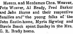 d. Agnes M. Brady, b 25 Jan 1889 Vernon, Yuma Co, Colo, d 19 Nov 1941, bur Glendale Cem, m 26 Jan 1908 to Fred Barker, b 30 Nov 1883 Nebr. 1908 Wray "Fred Barker and Agnes M. Brady of near Vernon, were united in marriage last Sunday at the Catholic church in this city, the pastor, Rev. Fr. Froegel, officiating." 1910 Yuma Co census, Pct 8 Vernon, Fred Barker,26 Nebr, farmer, general farm, Agnes M.,21 Colo (marr 2 yrs, 1 ch, 1 living), Frances E.,1 5/12 Colo. 1918 Yuma Co: WW I draft registration card: Fred Barker, b 30 Nov 1883, age 34; of Eckley, Yuma Co; occup: farmer; nearest relative: Agnes M. Barker; described as medium height, stout build, blue eyes, brown hair. 1920 Yuma Co census, Eckley Pct No 3, ED 275, sheet 6A, #117/118, Fred Barker,36 Nebr, farm operator, general farm, Agnes M.,31 Col, Mary A.,8 Col, George I.,6 Col, Georgia L.,4 3/12 Col, James E.,2 Col. 1930 Yuma Co census, Eckley Pct No 3, Fred Barker,47 Nebr (marr age 22), farmer, on farm, Agnes M.,41 Col (marr age 19), Mary A.,19 Col, George I.,16 Col, helper, on farm, Loretta G.,14 Col, James E.,12 Col, helper, on farm, John I.,9 Col, Earnest M.,6 Col. issue: (1) Frances E. Barker, b ca 1908-09 Colo. (2) Mary A. Barker, b ca 1911-12 Colo. (3) George I. Barker, b ca 1914 Colo. (4) Georgia Loretta Barker (Loretta), b ca 1916 Colo. (5) James E. Barker, b ca 1918 Colo. (6) John I. Barker, b ca 1921 Colo. (7) Earnest M. Barker, b ca 1924 Colo. e. Iva Magdalen Brady, b 19 May 1891 Yuma, d 16 Feb 1973 Wray, Yuma Co, Colo , bur Glendale Cem, m 12 Apr 1912 Vernon to Peter Lyman Weaver (Charlie's brother) , b 4 Oct 1889 Yuma Co, d 23 Mar 1963 Wray Co), bur Glendale Cem, s/o Lyman Fredereick Weaver and Emma Shedrick. 1920 Yuma Co census, Vernon Pct, ED 279, sheet 8B, #161/165, Peter L. Weaver,30 Col, farmer, gen farm, Iva M.,28 Col, Emma J.,6 8/12 Col, Delbert F.,4 1/12 Col, Leroy D.,2 2/12 Col. 1930 Yuma Co census, Pct 20 Mildred, ED 63-28, sheet 2A, #28/28, Peter L. Weaver,40 Col (marr age 21), Iva M.,38 Col (marr age 19), Emma J.,16 Col, Delbert F.,14 Col, Leroy D.,12 Col, Orton T.,6 Col, Paul R.,4 Col, Melvin D.,1 5/12 Col. issue: (1) Emma J. Weaver, b 14 May 1913 Yuma Co, d 16 May 2000 , m(1) 28 Nov 1930 Wray to Bob Willis. Emma m(2) 1958 to B. Knott. (2) Delbert Francis Weaver, b 11 Dec 1915 Yuma Co, d 14 Dec 1939 Chamberlain, SD, bur Glendale Cem. Single. (3) LeRoy Donald Weaver, b 8 Nov 1917 Yuma Co, d 8 Sep 1999 Wray ), bur Glendale Cem, m Sep 1948 Wray to Helen M. Wilson, b 18 Jan 1924, d 27 Jun 2002 Fort Collins, Larimer Co, Colo, bur Glendale Cem. (4) Orton Thomas Weaver, b 11 Jan 1924 Yuma, 3 Jun 1984 , bur Glendale Cem, m 20 Feb 1950 Wray to Carol Jean Brown, b 5 Feb 1931, d 18 Dec 2003 Eckley, Yuma Co, bur Glendale Cem. (5) Paul Richard Weaver, b 11 Nov 1925 Yuma, d 9 Dec 1995 Jefferson Co, Colo ), m 11 Nov 1947 Toledo, Iowa to Bonnie Weinke. (6) Melvin D. Weaver, b 1928 Yuma Co, m 24 Aug 1957 Wray to Shirley Andres. (7) Phyllis Nadine Weaver, b 1934 Heartstrong, Yuma Co, m 28 Jul 1952 Wray to Russell C. Tyndal/Tyndel, b 1927 Lamar, Chase Co, Neb, s/o Clinton O. Tindel and Vera M. Graham. issue: (a) Richard Lavern Tyndal, b 1953 Holyoke, Phillips Co, Colo m 1972 Holyoke to Linda Harding. (b) Christine M. Tyndal, b 1954 Holyoke, m Fleming, Logan Co, Colo to Larry D. Ride. (c) David Lynn Tyndal, b 1955, m 1982 Yuma Co to Karla Shell. (d) Gary Russell Tyndal, b 1956 Wray, m 1982/83 to Holyoke to Debra Danilson. (e) Scott Allen Tyndal, b 1963 Wray, m 1991 Holyoke to Rochelle Harvey. (f) Marsha LaRae Tyndal, b 1964 Holyoke, m(1) James Bregzeale, m(2) Ray Reitz. (g) Guy Leon Tyndal, b 1966 Holyoke, m Jun 1994 to Judy Vandergriff. He changed his name to Devon Vandal, 1994 Wray. f. Paul Joseph Brady, b 8 Aug 1893 Vernon, d 25 Jun 1962 Englewood, Arapahoe Co, Colo, bur Mt Olivet Cem, Wheat Ridge, Jefferson Co, Colo, m 14 Feb 1915 to Myrtia Mae Sigwing, b 12 Mar 1893 Atwood, Rawlins Co, Kans, d 21 Jun 1971 Littleton, Arapahoe Co, bur Mt Olivet Cem. His middle name given as Zeno by some sources. 1917, 5 Jun: Yuma Co, Colo: WW I draft registration card: Paul Joseph Brady, b 8 Aug 1893 Yuma Co, age 23; of Laird, Colo; occup: farmer; married with 2 children; described as tall, medium build, brown eyes, dark brown hair. 1920 Yuma Co census, Laird, ED 272, sheet 4A, #67/68, Paul J. Brady,26 Col (Ill,Mo), farmer, general farm, Myrta M., 26 Kans, Doris P.,4 1/12 Col, Eldora E.,2 2/12 Col, John A.,?9/12 Col. 1930 Yuma Co census, Laird Pct 1, ED 63-1, sheet 3B, #68/68, Paul J. Brady,36 Col (marr age 21, NY,Mo), farmer, farm, Myrtia M.,37 Nebr (marr age 22), Doris P.,14 Col, Eldora E.,12 Co, John A.,10 Col, Ronald P.,9 Col, Lawrence A., 9/12 Colo. issue: (1) Doris P. Brady, b ca 1916 Colo. (2) Eldora E. Brady, b ca 1918 Colo. (3) John Alvin Brady, b 12 Jul 1919 Laird, Yuma Co, d 13 Dec 1975 Littleton, Arapahoe Co (SSDI 523-34-1617 Colo). bur Fort Logan National Cem, Denver, m 1953 to Irene Cecelia Michaud, b 19 Oct 1924 Loveland, Larimer Co, d 2 Mar 1999 Littleton , bur Fort Logan National Cem. issue: (a) Richard P. Brady, b ca 1954. Of Greeley in 1999. (b) Jean Marie Brady, b ca 1955. Of Denver in 1999. (c) Carolyn Irene Brady, b ca 1957, m 1996 to Jerry Wayne Hilgenberg, b ca 1961, s/o Robert J. Hilgenberg and Mar- garet Whitman. Of Loveland in 1999. (d) Loretta Ann Brady, b ca 1959. Of Highlands Ranch in 1999. (e) Lawrence Arthur Brady, b ca 1960. Of Littleton in 1999. (f) Marilyn Eileen Brady, b ca 1963, m 12 Oct 1991 Larimer Co, Colo to James R. Hilgenberg (Jim), s/o Robert J. Hilgenberg and Margaret Whitman. Of Loveland in 1999. (g) Maureen Michelle Brady, b ca 1965, m Ray Corcorran. Of Okla in 1999. (h) Patrick Michael Brady, b ca 1967. Of Fort Collins in 1999. (4) Ronald P. Brady, b ca 1921 Colo. (5) Lawrence A. Brady, b ca 1929 Colo. g. Bertha Alice Brady, b 22 Feb 1896 Vernon, d Jul 1983 Wray) , bur Glendale Cem, m 28 Feb 1916 to John Owen Eastin (Owen), b 29 Jun 1894 Mo, d Oct 1970 . 1920 Yuma Co census, Vernon Pct, John O. 