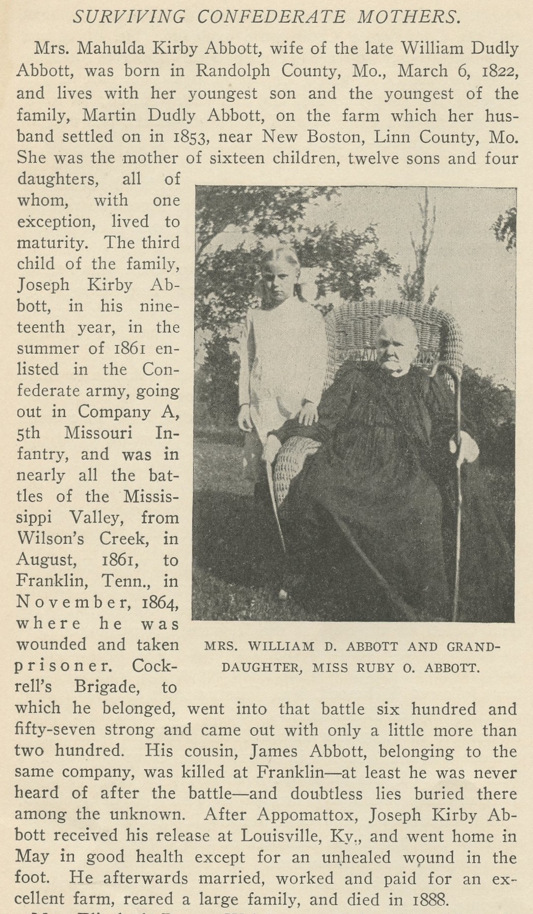 In 1850 Macon County, Missouri, Dudly Abbott is 29 born in Ohio, with Mahulal 28, Missouri. They have Luther 12, John 9, Isiah 8, Sarah 6, Caroline 5, Martha A. 3, and Hubbard 2. William Dudley Abbott is buried in Linn County, Missouri # 117769639. William Dudley Abbott 1821-1896 # 117769639 is buried in Linn County, Missouri, with Mahulda (Kirby) Abbott 1822-1921, # 117769658. Confederate Veteran - 1915