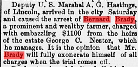 BARNARD BRADY. Within the confines or Belmont Precinct, and in the southwestern part of section 24, is located the farm of this gentleman, which embraces 160 acres of land, and has been brought to a good state of cultivation. One of its most attractive features is the handsome and substantial residence, while a good barn and all the other necessary out-buildings, with fruit and shade trees, form a most attractive background. Mr. Brady has been thorough and successful as an agriculturist, and is a man of good business capacities. As a citizen he is esteemed as one of the most valued members of his community. Our subject was born at Port George in British America, Aug. 17, 1830, and is the son of Antwin and Mary (Riley) Brady, who were natives of Ireland, and the former a British soldier in the War of 1812. Later he went to Ireland, and there the subject of this sketch spent a portion of his boyhood. His parents died in Ireland, and Barnard then returned to British America with relatives, and came to this county in August of 1854, while Nebraska was a Territory. He took up a claim that same year opposite St. Joseph in Kansas, but the border war coming on he was forced to flee, and found refuge in Macon County, Mo., until the troubles were over. Mr. Brady in the spring of 1863 returned to this county during the progress of the Civil War, but in the meantime had served as a Confederate soldier in Company I, 4th Missouri Infantry. He located permanently on his present farm in September, 1870, and is now the owner of one of the most desirable estates in this part of the county. Our subject was married, in May, 1870, to Mrs. Sarah Nestor, widow of George W. Nestor. and daughter of Dudley and Kerby Abbott. Mrs. Brady was born Oct. 9, 1843, in Missouri. Her parents were natives of Ohio, and their household consisted of fourteen children. Of her union with our subject there have been born five children, four of whom are living, namely: Thomas H., John D., Edward W. and Andrew J. The eldest is sixteen years of age and the youngest nine. Of the first marriage of Mrs. Brady there had been born two children. both daughters, Caroline and Martha, who are living in Oregon and married. Mr. Brady, politically, is a Democrat, and socially, in 1883 identified himself with the Masonic fraternity. Bernard Brady died in 1893, and is buried in Nebraska City, Nebraska. 1885 Nebraska City
