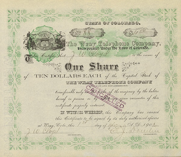 Stock certificate for sale . 1) Wray Telephone Co., issued in 1902 to J.W. Cloyd for one share at $10 each. Issued at Wray and signed by E.J. Donlin as president and J.W. Cloyd as secretary. Colorado state seal, green underprint. EF.