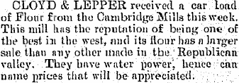 December 1899 Cloyd & Lepper's advertised that they had "received a car of salt and will make you a close price." They also advertised Overalls, Hosiery and Notions.