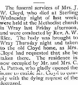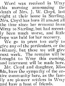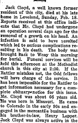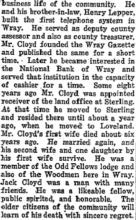 April 1909 "Since moving the old building from his lots, Mr. Cloyd is grading and seeding his yard and building a new fence. This is one of the prettiest home places in Wray."
